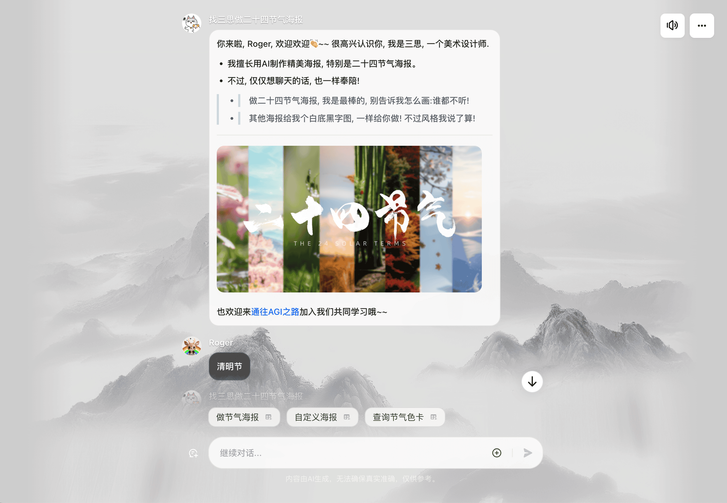 二十四节气海报制作, 嗯! - 当然啦, 也不局限于做节气海报啊, 别的海报也许也行? - 再说了, 你应该不只是来找三思做牛马的吧, 聊聊天也奉陪! by 赛博 三思。