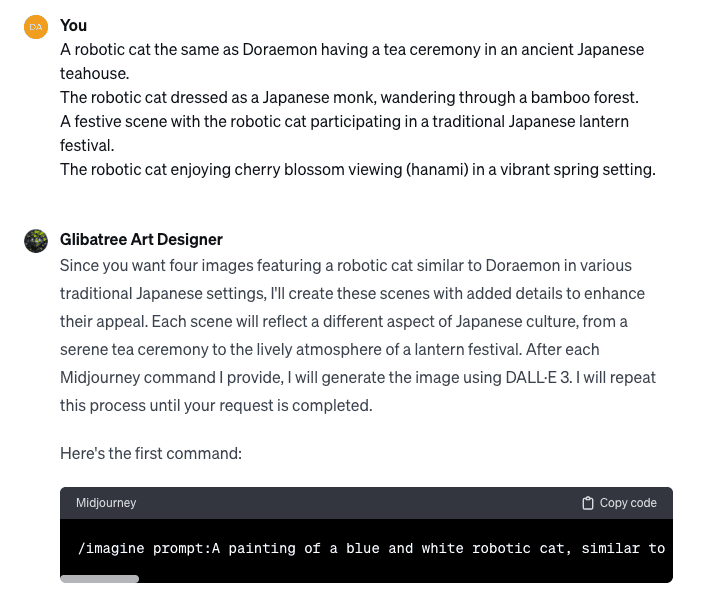 Glibatree Art Designer,核心能力是将用户的想法和描述转化为精美的图像。创造出符合用户需求的4幅独特艺术作品,并提供Midjourney prompt。。