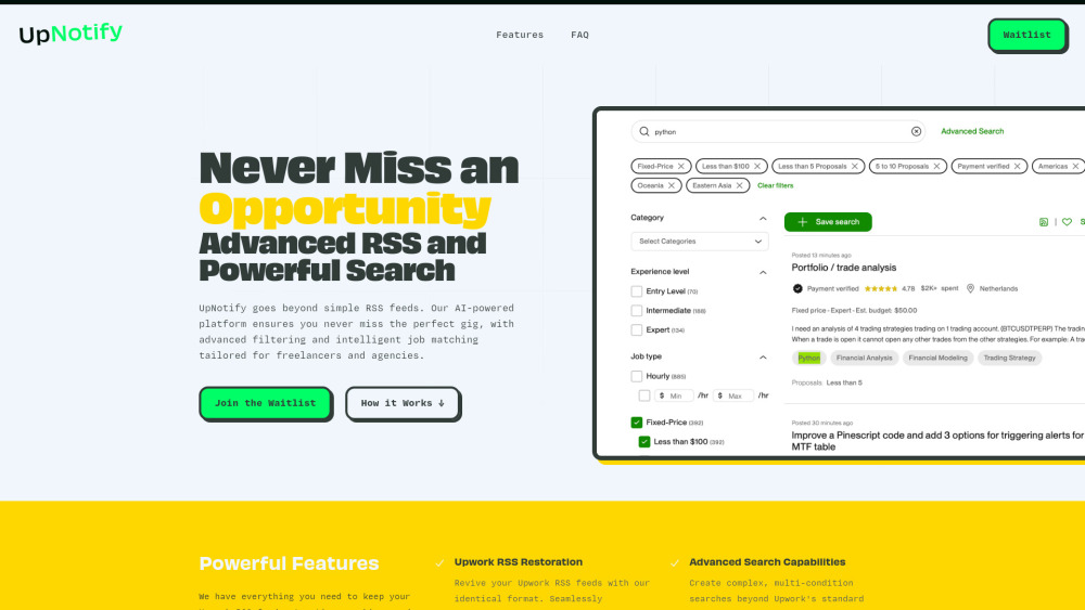 UpNotify 恢复 Upwork RSS,提供高级搜索和实时工作提醒。。