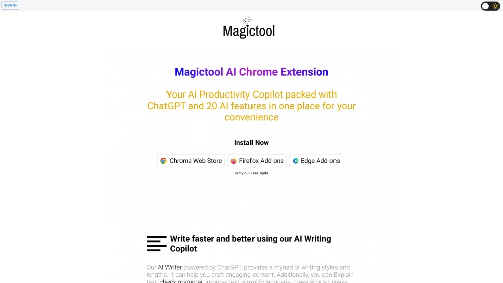 Magictool AI:一个提供写作、摘要、图像生成等 AI 工具的生产力中心。。