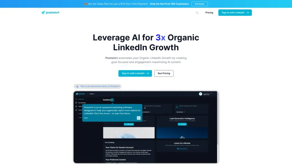 Postsmrt 使用 AI 驱动的内容调度和潜在客户生成实现 LinkedIn 增长自动化。。