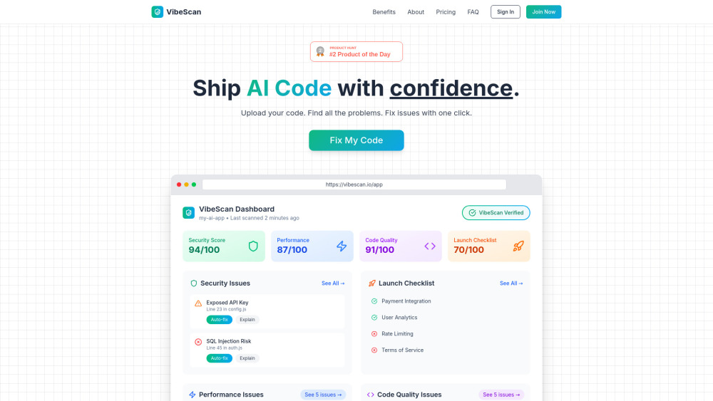 扫描、发现并修复 AI 生成代码中的问题,以便自信地发布。。