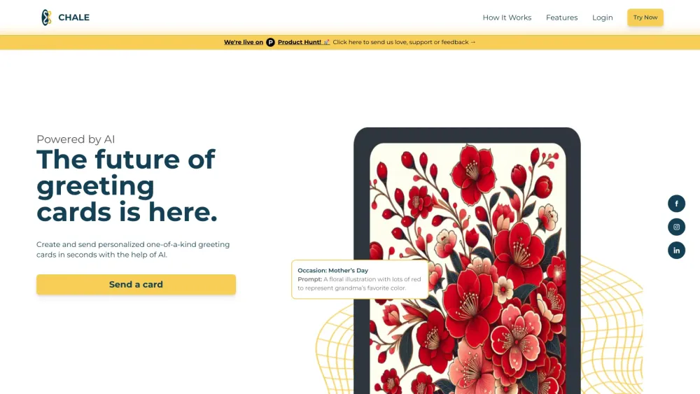 CHALE是一个AI驱动的贺卡创作工具,可以快速发送个性化和独特的贺卡。。