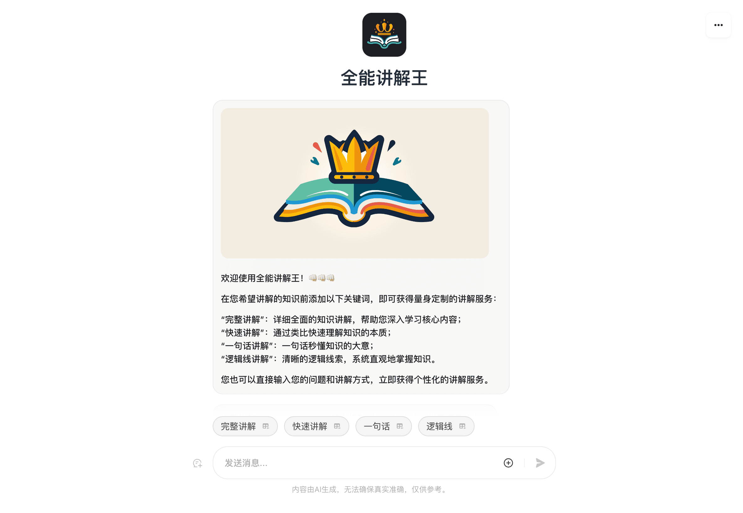 “全能讲解王”是一个强大的知识讲解工具,专为满足不同学习需求的用户而设计。无论您是需要全面深入的理解,还是快速掌握核心概念,亦或是希望通过一句话快速了解知识点,全能讲解王都能为您提供最佳的学习体验。。