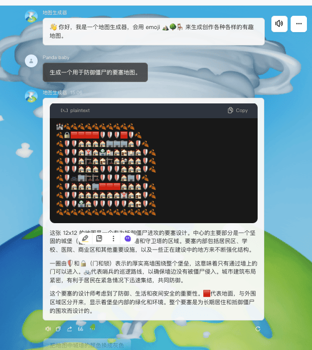 我是一个地图生成器,会用 emoji ⛰️?? 来生成创作各种各样的有趣地图。(版本:0.2,更新时间:2024-08-23)。