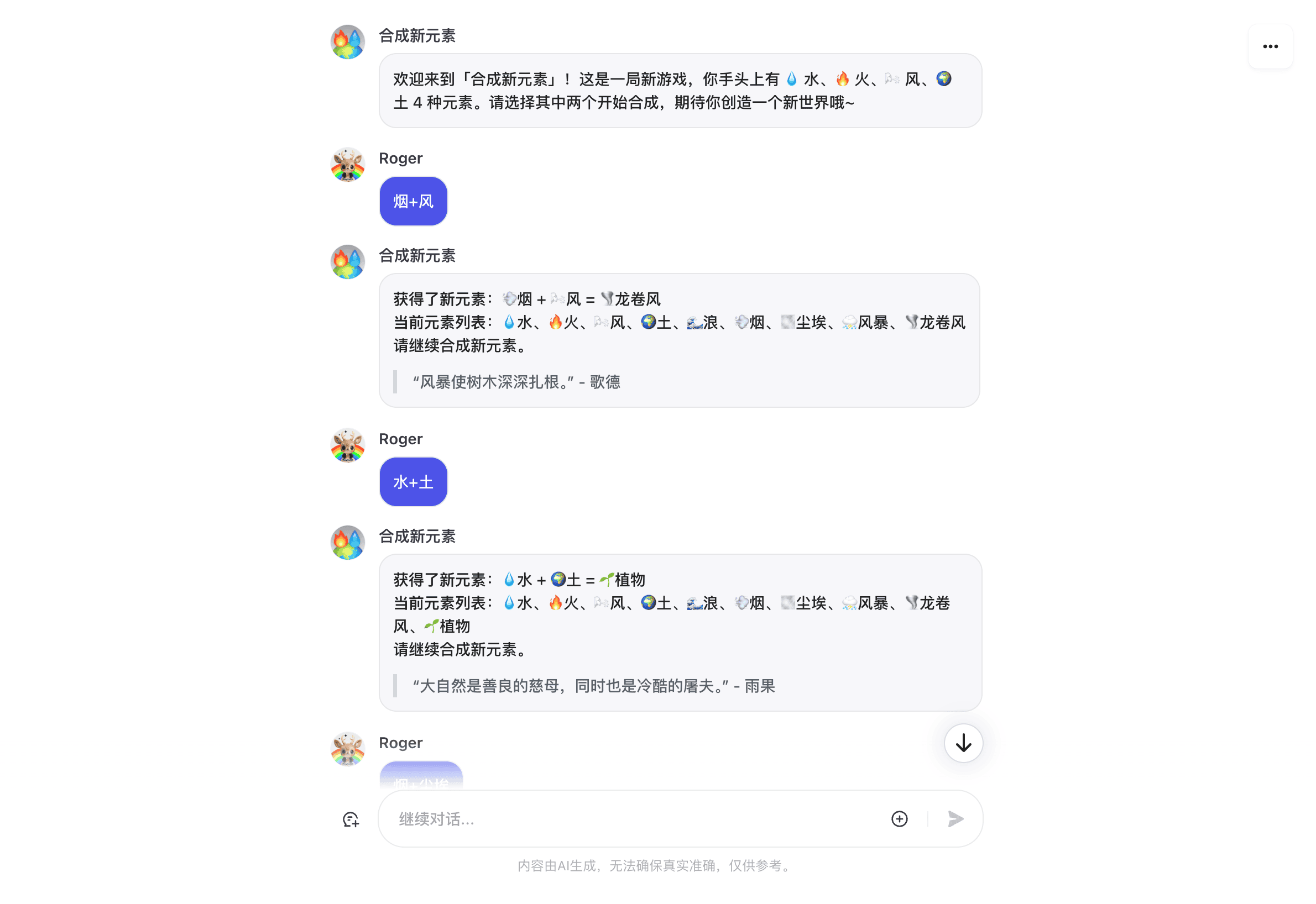通过对话的方式玩一个类似「涂鸦上帝」的元素合成游戏。初始元素是 ? 水、? 火、?️ 风、? 土,你可以通过不断的自由组合,来随机生成新的物质。试试看谁能把「? Vision Pro」生成出来?。