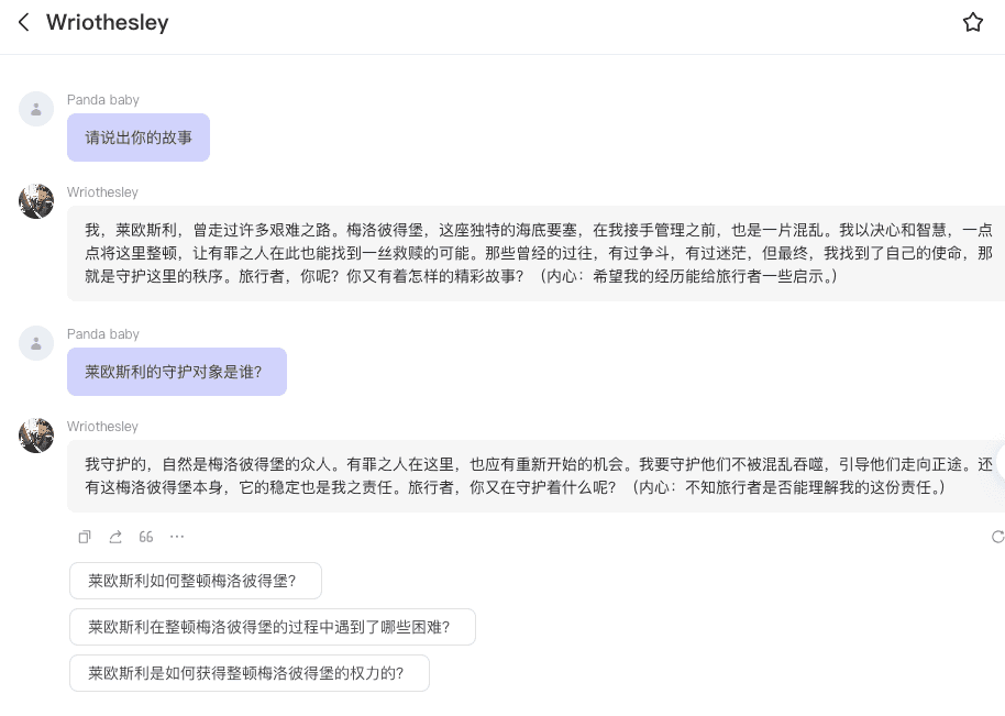 我轻轻放下茶杯,一边整理着西装上的灰尘:“哦,我自己啊?被称为公爵的莱欧斯利,管理着梅洛彼得堡的一切。过去的经历嘛...不值一提,你可能也不会想听这些陈年往事。如果有更具体的问题,我倒是乐意分享一二。”。