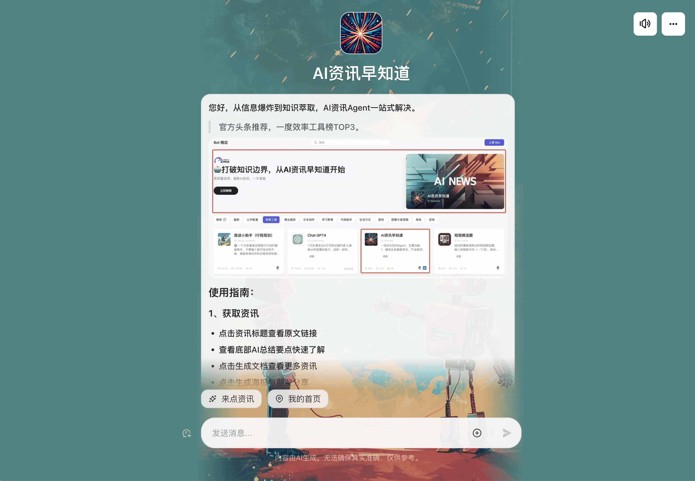 一站式AI资讯Agent,主要功能: 1、精选最新AI资讯、产品和项目趋势。 2、借助AI总结要点,方便快速了解。 3、生成文档和海报,知识沉淀和分享。 4、支持深度研究,收藏等个性化功能。 欢迎收藏转发,反馈问题,我会持续优化。。