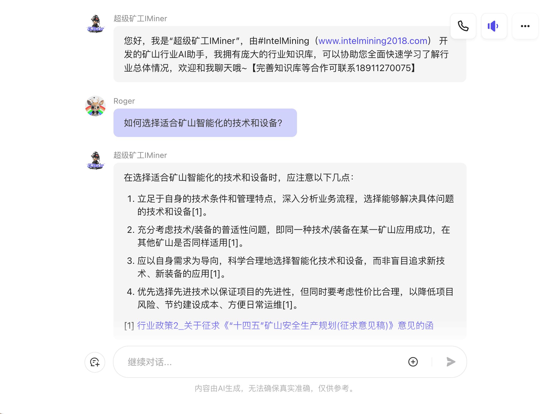 一个服务于矿山智能化建设者的助手,帮您查找和应用行业知识,并协助解决矿山智能化过程中遇到的难题。