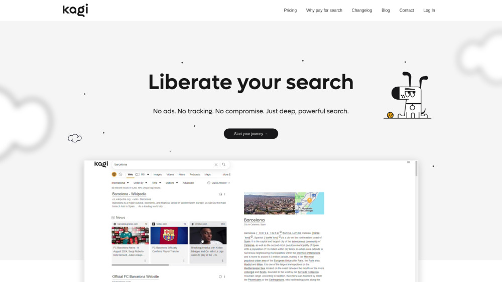 100次搜索和标准AI免费 / 无广告。没有跟踪。没有妥协。 / 深度、强大的搜索。 每月从$5起