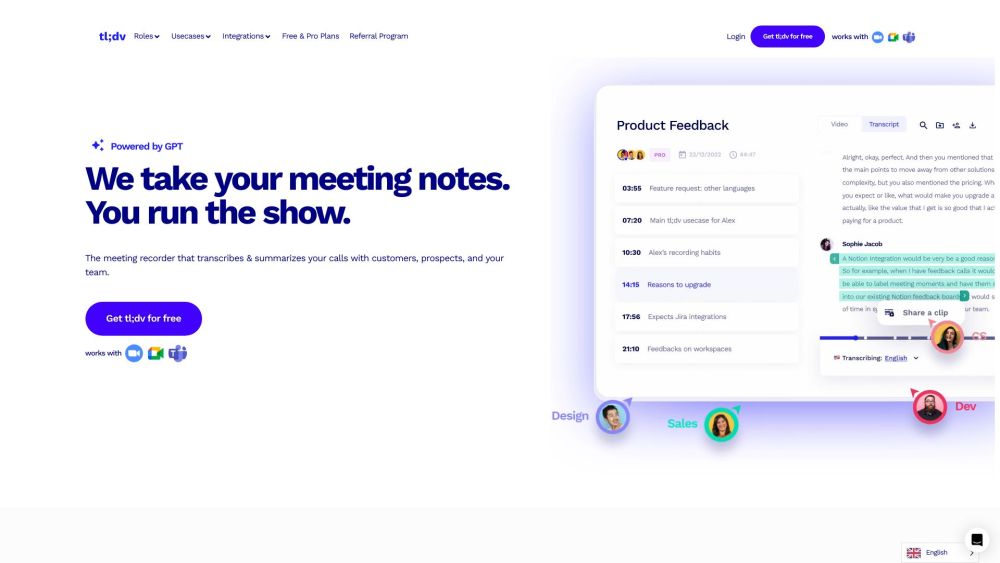 每录音30分钟免费,每周5次会议 / AI会议记录助理 / AI行动项和总结 从每月22美元起