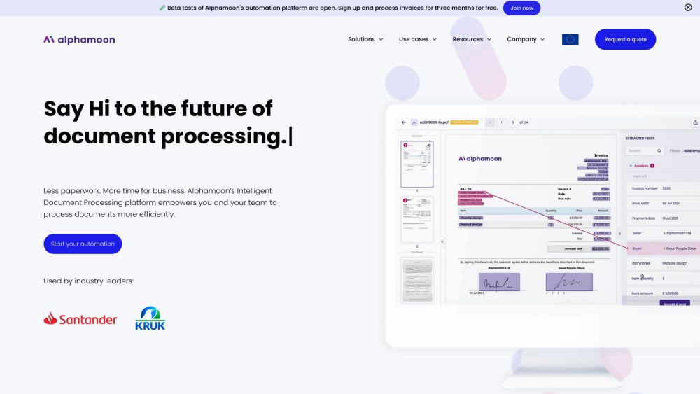 30天试用500页 / 自动化文档处理工作流程 / 从任何文档类型中提取数据 / 无缝集成 每页从0.20美元起