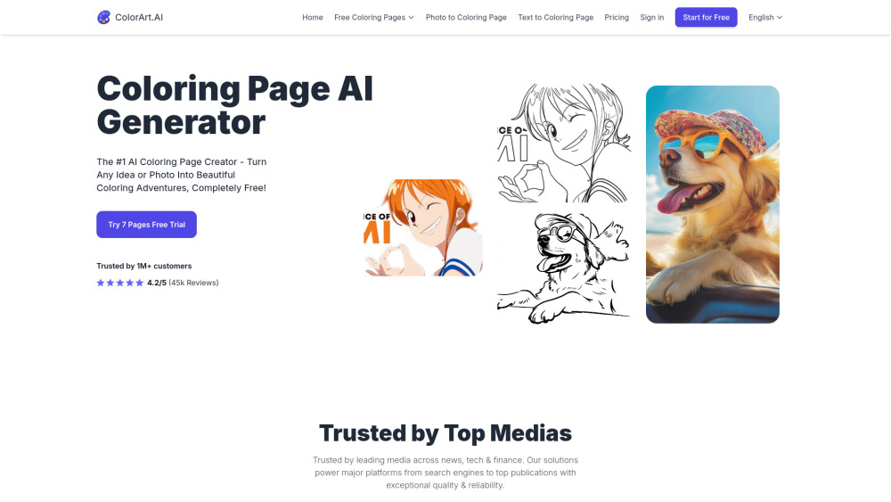 7页免费试用 / 文本到着色页 / 照片到着色页 从每月6.99美元起,可获得150个着色页