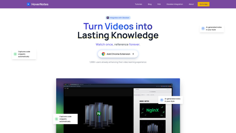 包含 20 分钟的 AI 视频笔记 / AI 驱动的笔记 / Obsidian 集成 从 9.99 美元每月起