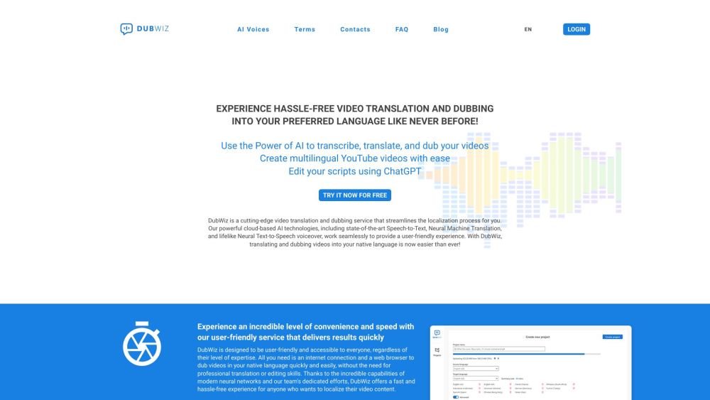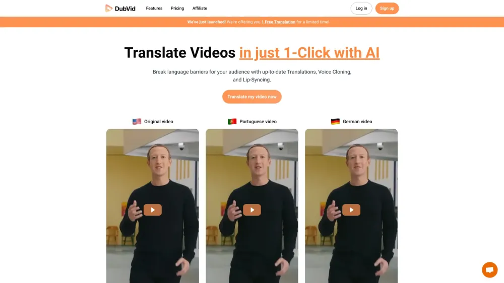 15分钟免费视频 / 自动翻译和配音视频 / 多语言支持 / 快速处理时间 从每月$23.99起