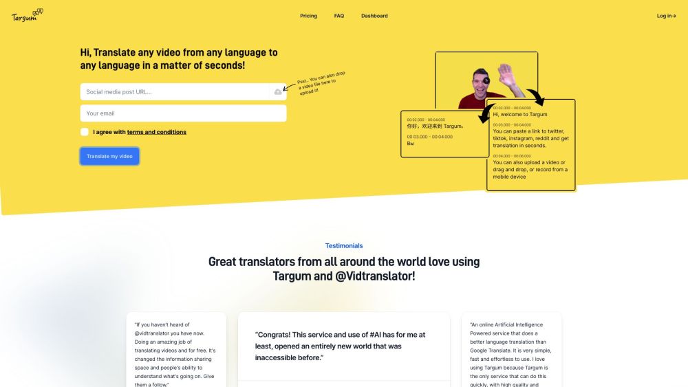 超级快速AI视频翻译 / 翻译至99种以上语言 / 下载翻译后的MP4文件 从每月6美元起