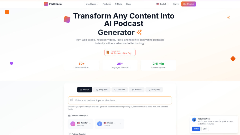 100积分≈4分钟免费 / 将任何内容转化为专业播客 / 50+自然AI声音 从$9.99/周开始