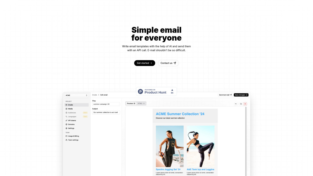 每月500封邮件免费 / AI辅助邮件编辑 / 通过API发送邮件 从每月19美元起