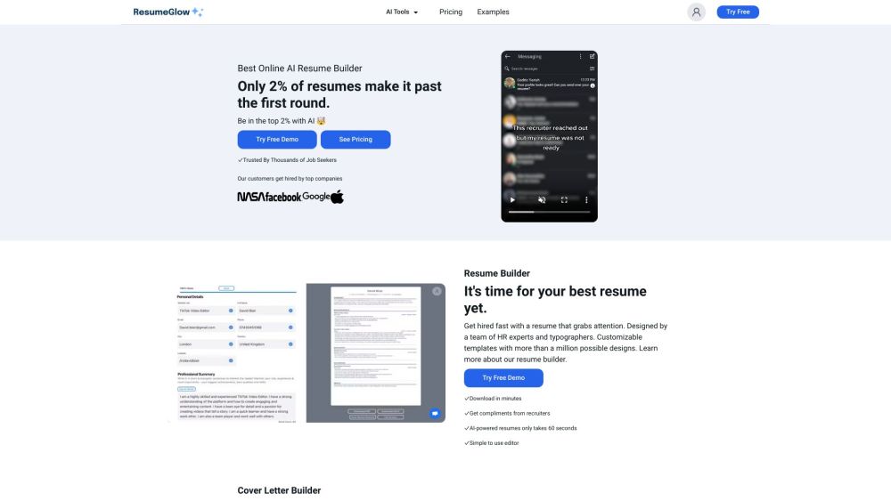 免费简历创建 / AI 驱动的简历生成器 / 无限 AI 写作积分 / 多种格式(MS Word 和 PDF) 从每月 $19.95 起