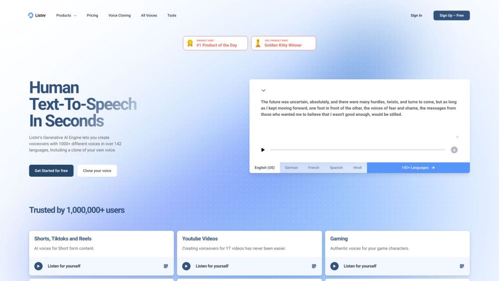 1万个字符免费 / 将文本、PDF和图像转换为清晰的音频 / 最自然的AI声音 / 无需登录注册 每月仅需14美元起