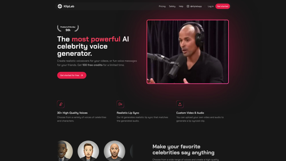 100个免费积分 / AI名人语音生成器 / 真实语音配音 / 逼真的口型同步 每月仅需5美元起