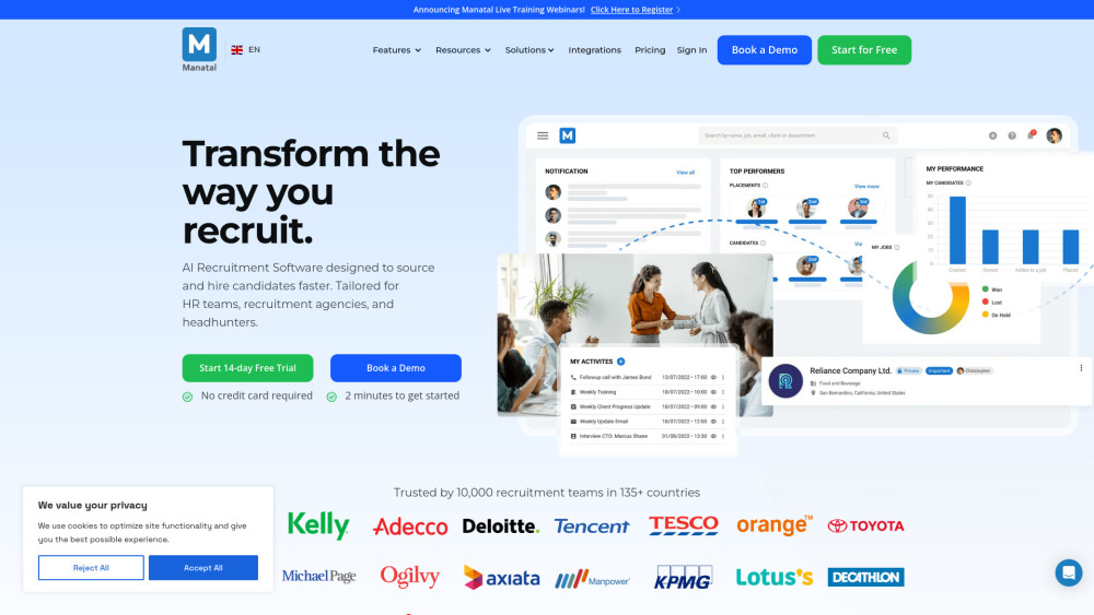 14天免费试用 / AI 招聘软件 / 应聘者跟踪系统 每用户每月从 $15 起