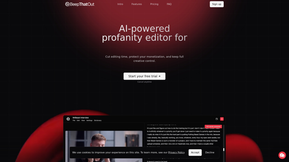 7天免费试用 / 人工智能驱动的脏话编辑器 / 减少编辑时间 / 保护变现 从每月26美元起
