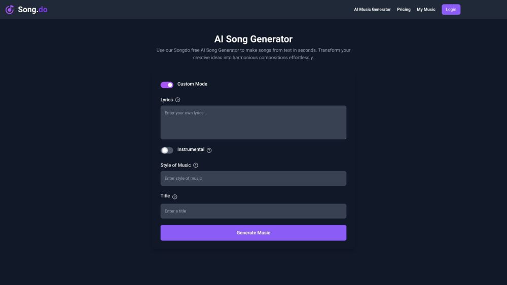 每天8个免费积分 / 生成原创旋律、歌词和完整歌曲 / 多种生成模式 / 无需登录或注册 起价$4.9/月