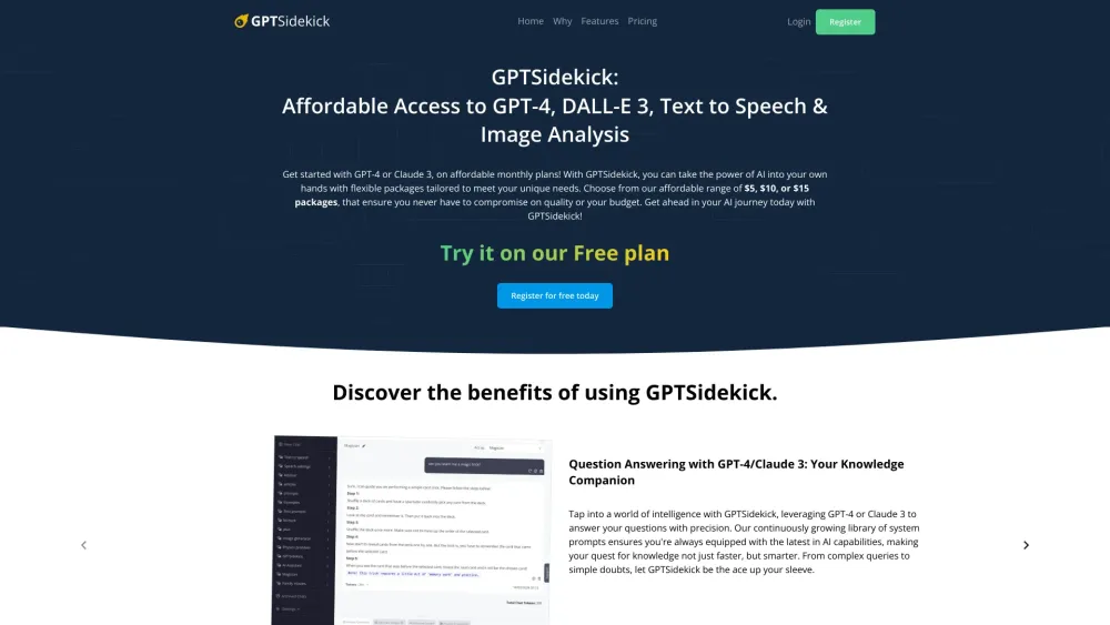 每月免费300个GPT4/Claude问题 / 配备GPT4、Claude等的AI助手 / 使用DALLE 3进行图像生成 起价9美元/月