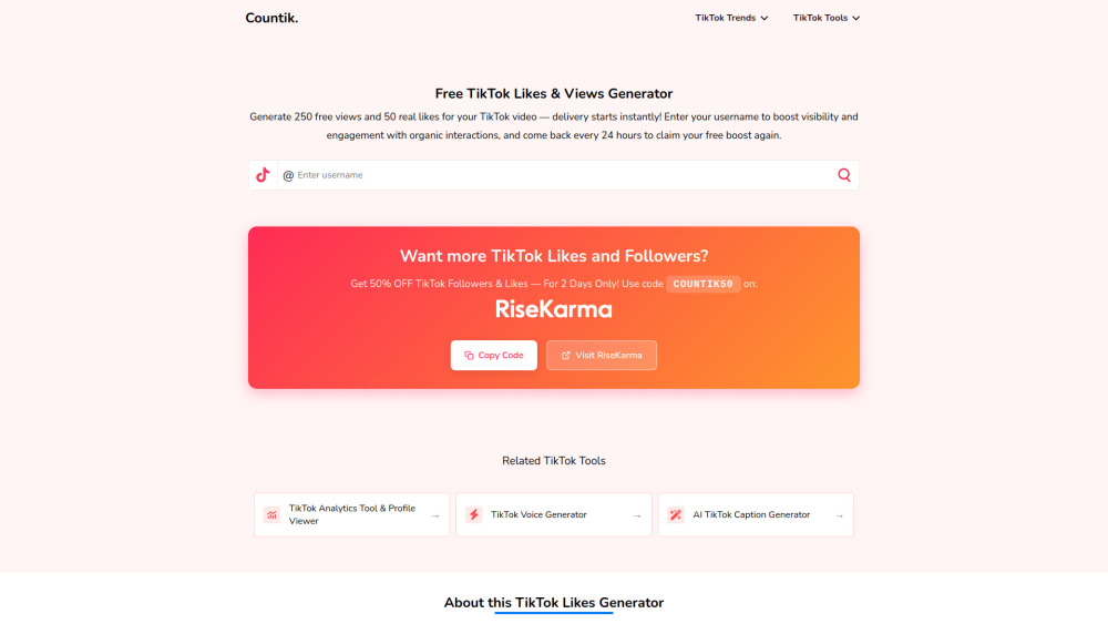 每日250个免费观看和50个真实点赞 / 免费TikTok点赞与观看生成器 / TikTok分析工具