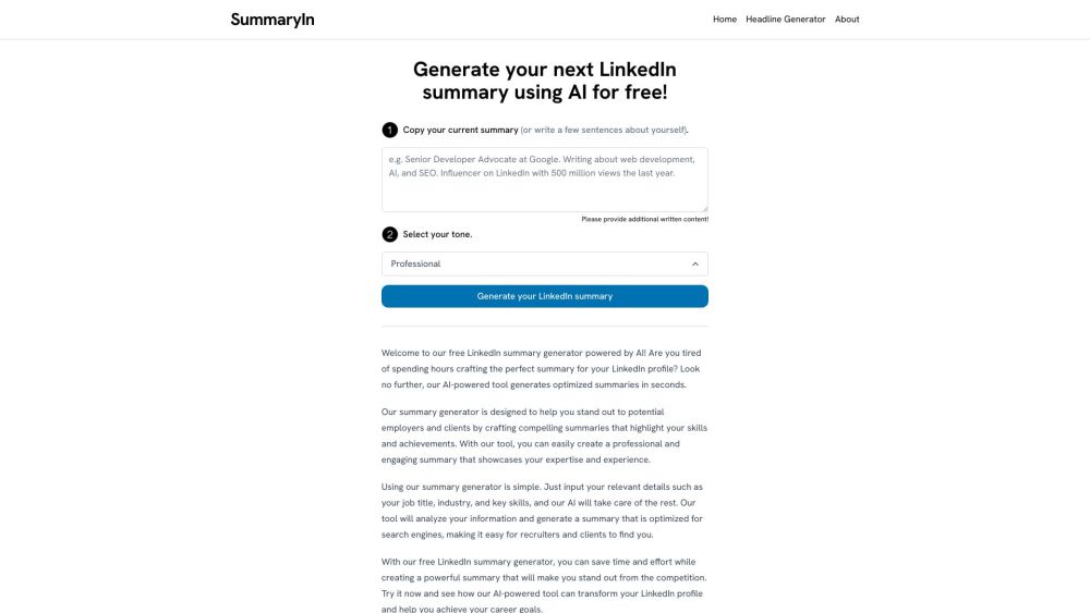免费/人工智能驱动的LinkedIn总结生成器/撰写获胜的总结以脱颖而出/在几秒钟内生成优化的总结