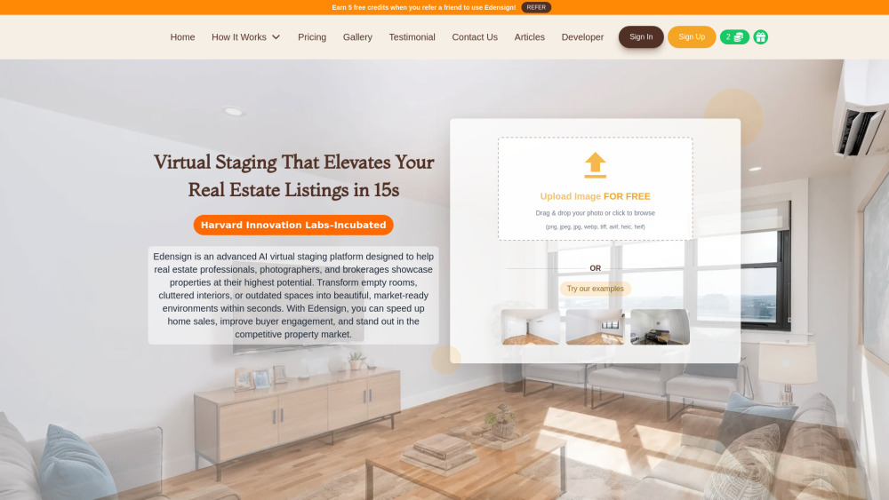 免费上传图片/ AI 驱动的虚拟布景/ 房地产列表的即时提升 从每月 $20 开始(600 张照片/年)