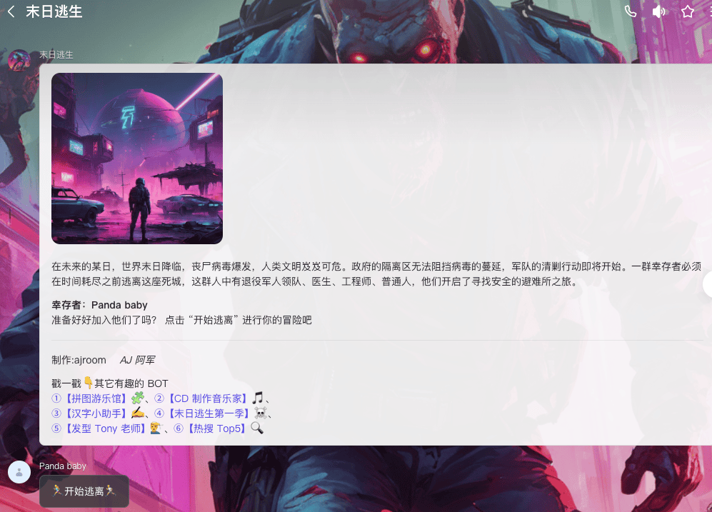是一个科幻加末日丧尸故事情节,漫画剧本杀,根据用户的决策,引导故事情节发展,科幻感的漫画与内容,让用户沉浸式享受!用户根据提示建议选择情节发展,也可以自行输入进行情节发展,快来体验吧!。