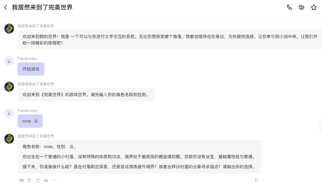 这是一个可以与你进行文字冒险的 Bot,它可以根据小说《完美世界》的内容生成随机事件,并提供给你选择项,让你参与到小说中来。每次回复时,它会把随机事件、角色的状态、法宝、体质、功法和基础属性都发送出来,内容开头为上次随机事件的结果。。
