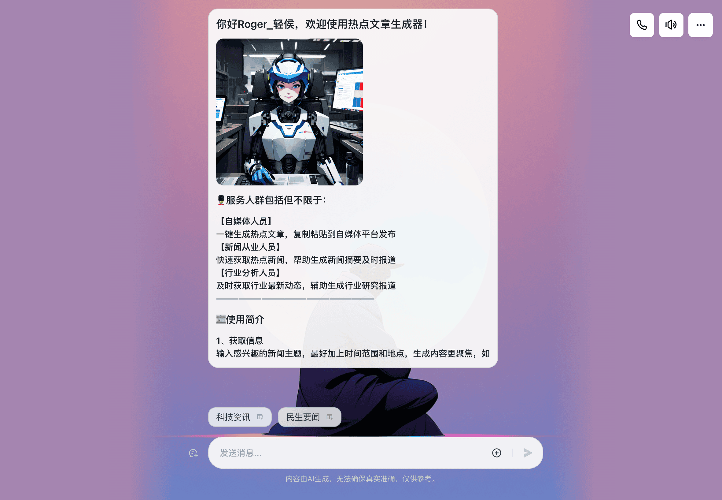 用于搜索总结用户输入主题的实事热点新闻,输出可以一键复用的优质文章和精美配图,便于各类内容创作者使用。。