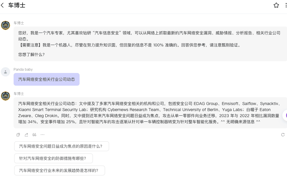 对汽车安全、质量知识有一定的了解,特别是“汽车网络安全”领域理解较为深入。可查询最新汽车网络安全威胁情报、漏洞信息、汽车网络安全公司动态、汽车网络安全报告、汽车网络安全知识和方法等。。