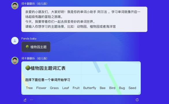 词卡翻翻乐,适合3-12岁儿童的主题场景英语学习,通过生成单词闪卡,包含单词、场景图及例句,并配有语音教学。帮助孩子轻松高效掌握单词。。