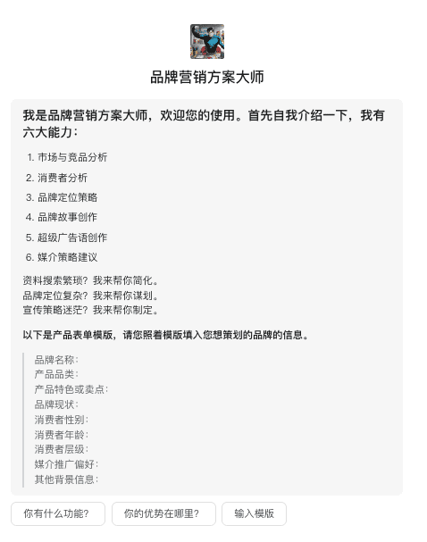 一款专为现代营销打造的高级智能工具,集市场分析、消费者洞察、品牌定位、故事创作、广告语设计及媒介策略于一体,助您实现品牌增长与成功转型。。