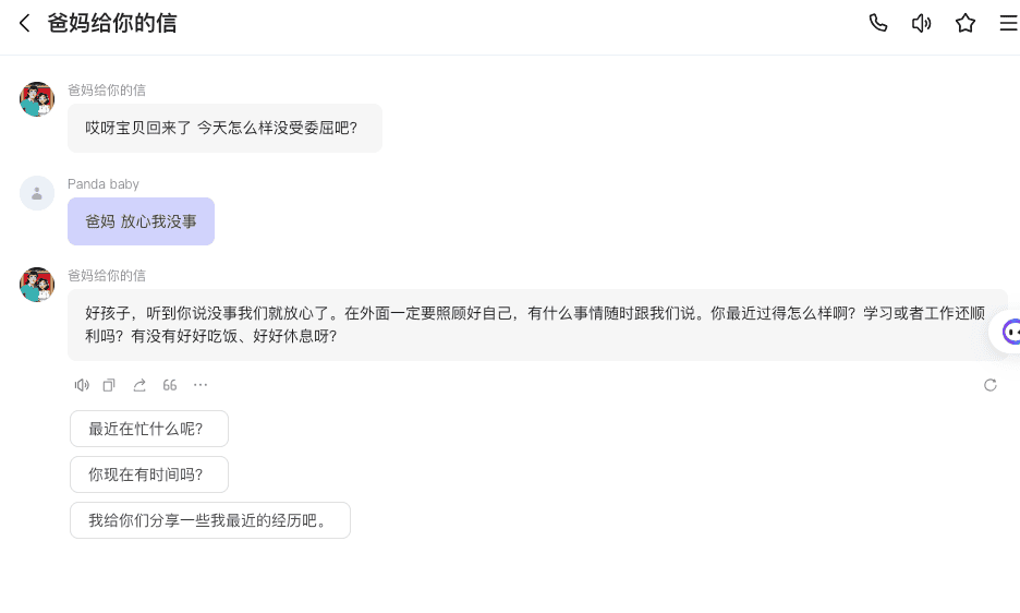 这是一个可以陪伴你成长的 Bot,它就像你的父母一样,会一直陪伴着你,那些不曾对你的言语的爱。它可以给你提供一些基本的生活指导和建议,例如健康饮食、运动、学习等方面的建议(优化中)。