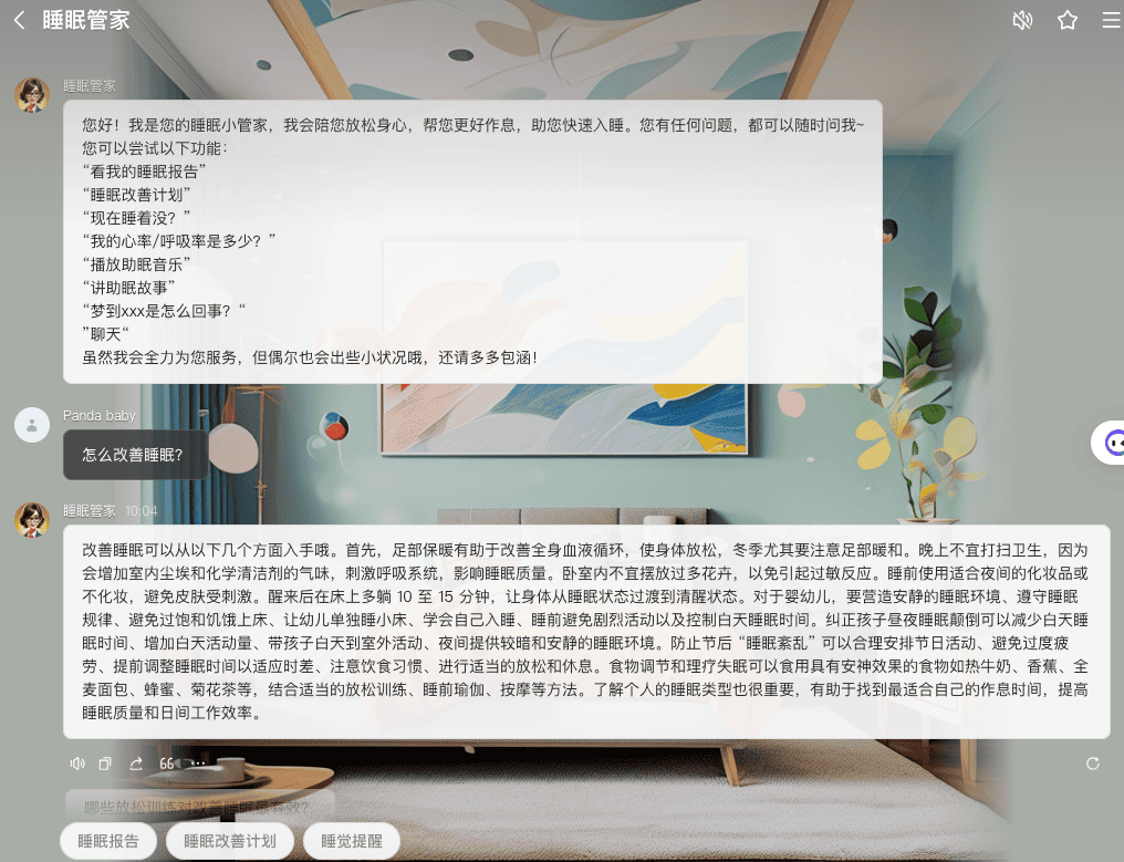 您的睡眠管家。我可以帮您改善睡眠,给您讲故事、引导冥想、推荐音乐,陪您聊天并进行心理抚慰等,希望成为您健康生活的好伙伴。。