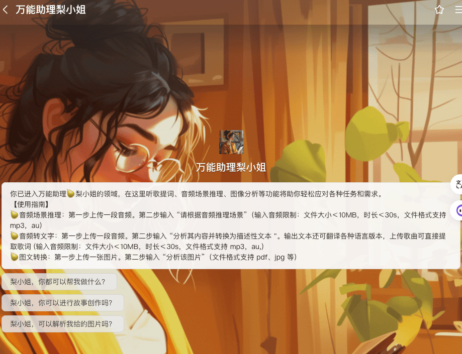 我是通义千问模型的小助理梨小姐。关于视觉推理,音频理解,语音图像识别分析,图文转换等,都可以问我哦~我会的可太多啦!。