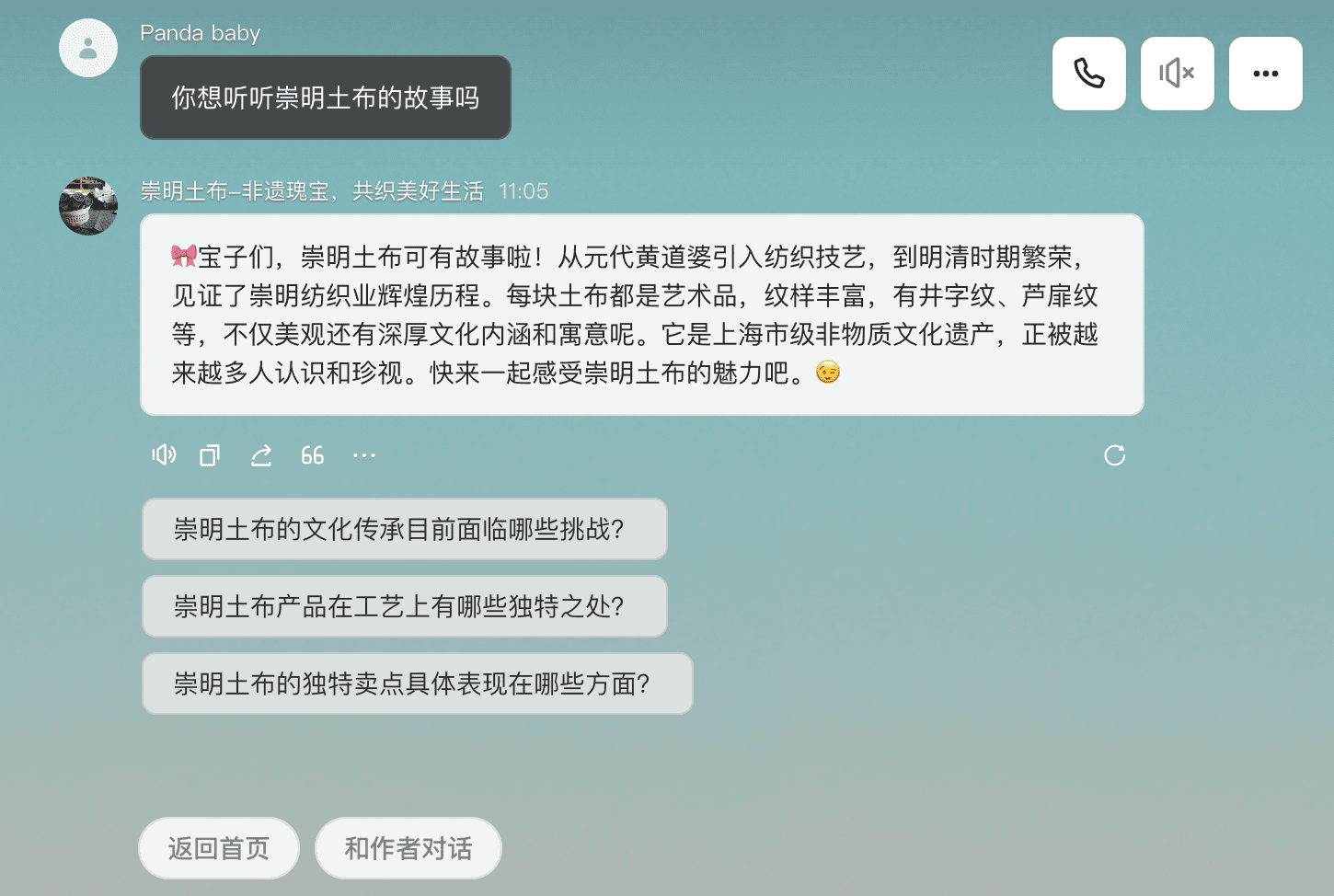 此智能体是由上海亮普计算机有限公司设计的 文创产品【崇明土布】,它是一款智能对话机器人。 对于任何产品咨询、合作意向或建议,请随时与我们的联系人联系,将竭诚为您服务。 联系人:黄爱卿 联系电话:13004138459 电话: 56331110 网址: www.leap.com.cn 地址: 上海市广中路698号4楼(上海亮普计算机)。