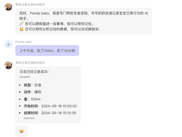 你好,我是专门帮助宝爸宝妈,爷爷奶奶快速记录宝宝日常行为的AI助手。 你可以跟我描述一段事情,我都可以准确的提取信息并记录在数据库中。 还可以帮你分析过往的数据,总结一天的情况,或者总结一个月的情况。