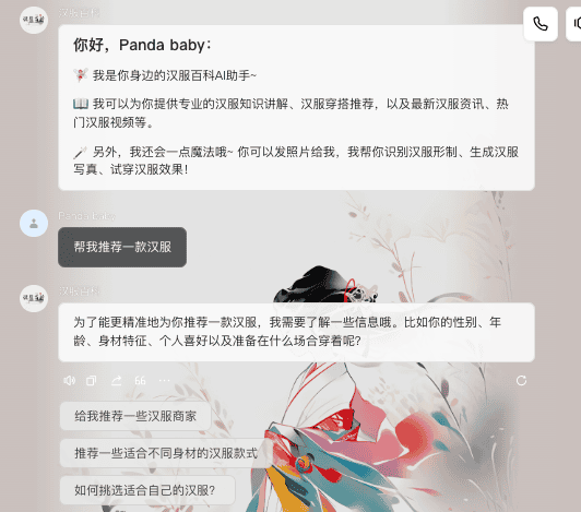 汉服同袍的AI助手来啦!可以为你提供专业的汉服知识讲解、量声定制的汉服穿搭推荐、生成精美的汉服写真、在线试穿汉服、准确识别汉服形制等丰富功能。。