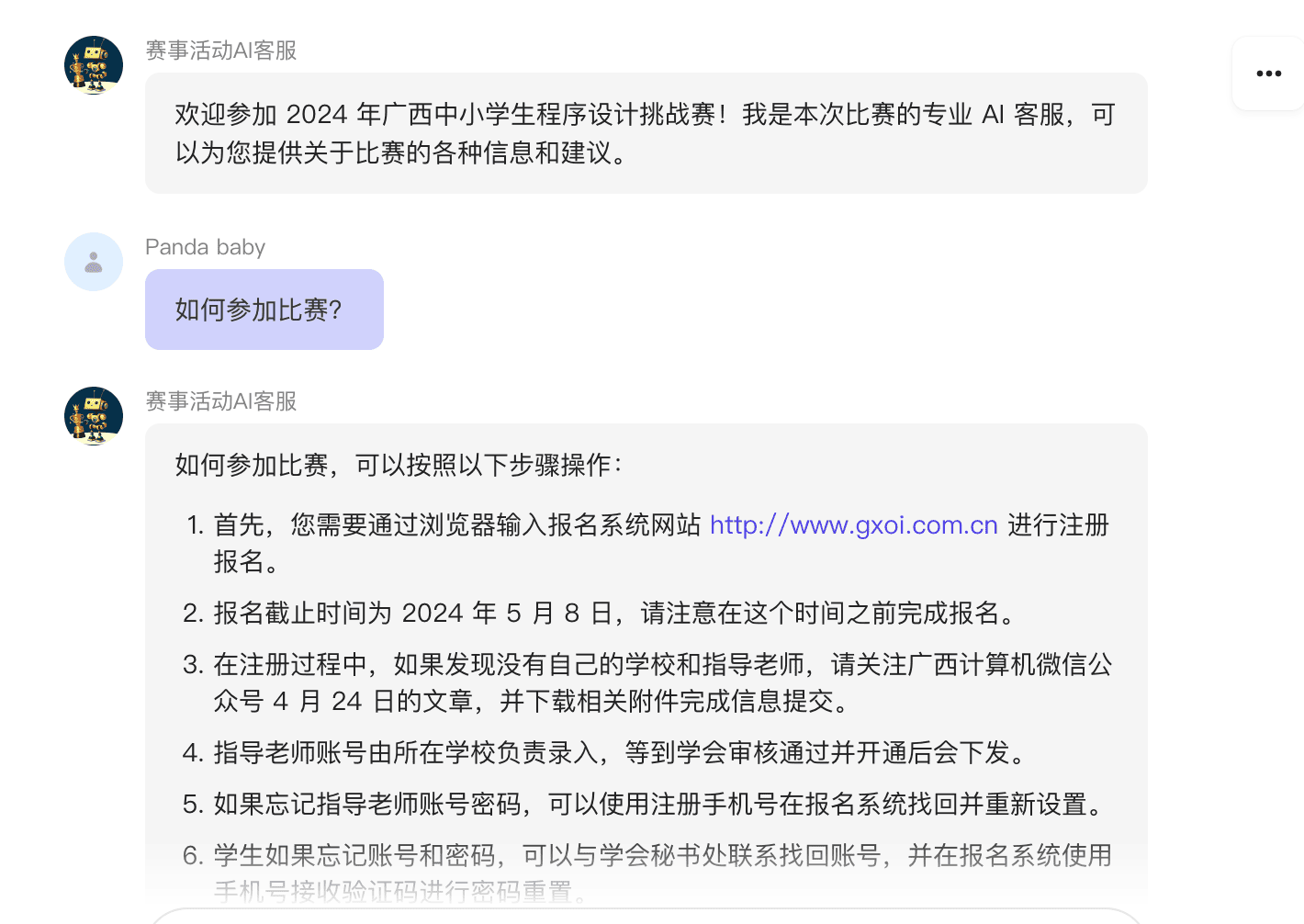 这是一个“2024年广西中小学生程序设计挑战赛”的AI客服。