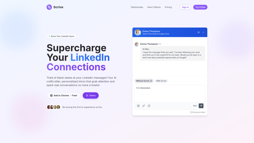 Scrive 提供 AI 驱动的缩略图生成和 LinkedIn 消息辅助,以提高参与度。。