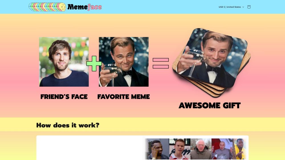 一个创建个性化 meme 主题礼物的服务,您可以将自己的脸放在上面。。
