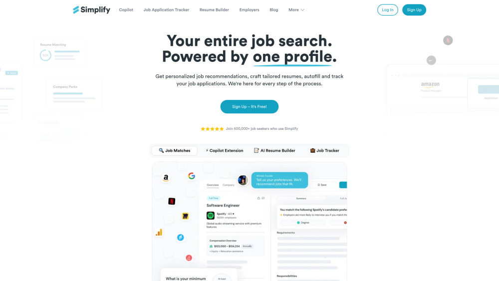 Simplify通过AI驱动的工具为求职者提供匹配、简历构建和申请跟踪的服务,简化求职过程。。
