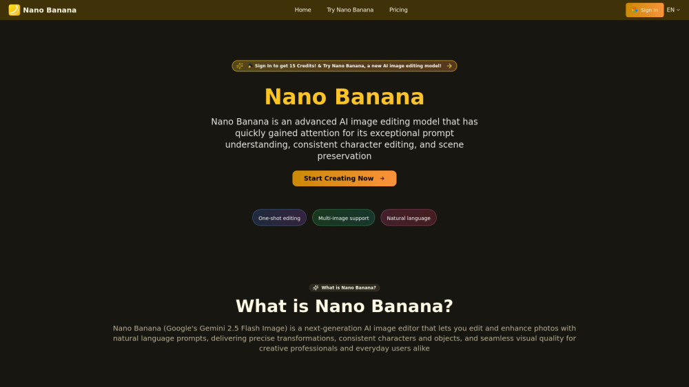 Nanana AI 是一个专业的 AI 图像生成器和 AI 图像编辑器,采用谷歌的 Nano Banana 模型。主要特征包括业界领先的 94% 文本渲染准确性、几秒钟内的极速处理、全面的历史管理(包含自定义文件夹组织),以及商业准备输出(无版税,无水印)。体验优越的 Nano Banana 技术,立即无注册访问,使其成为最容易使用和功能最全的 AI 图像生成器。。