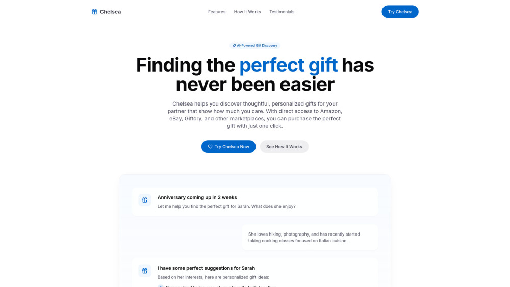切尔西是一个基于人工智能的礼物发现平台,提供个性化的伴侣礼物。。